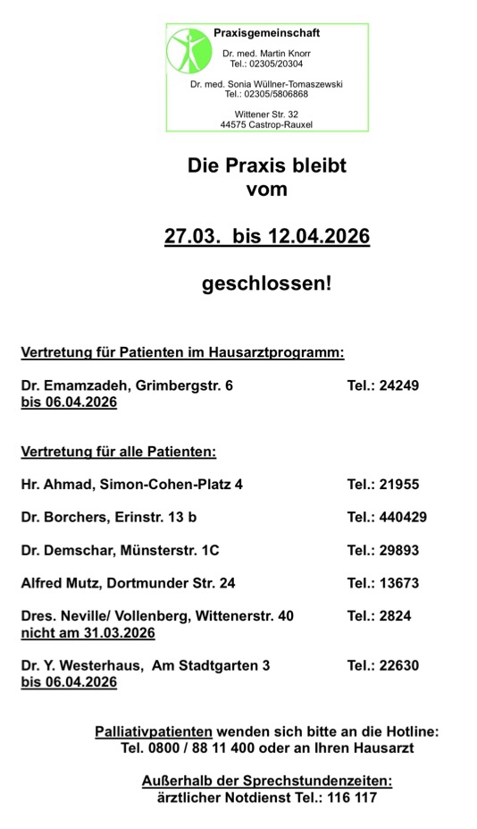 Darüberhinaus ist die Begleitung meiner Patienten und deren Angehörigen in der letzten Lebensphase im Rahmen der palliativmedizinischen Versorgung mit dem PKD Herne/Castrop-Rauxel ein Hauptschwerpunkt meiner Tätigkeit. Die palliativmedizinische Versorgung ist für alle Patienten in Castrop-Rauxel und angrenzenden Stadtteilen von Herne möglich.